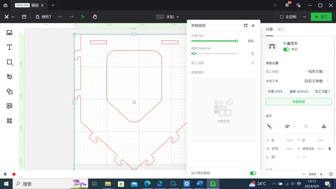 材料材质 木板 毛毡 使用机型 D1 Pro 20W 适用机型 xTool D1 Pro、xTool P2、xTool S1 案例文件 猫屋下载 注意事项 使用其它类型机器加工需调整参数 案例制作 加工参数参考 加工模式加工类型功率速度底板平面加工线条雕刻100%6mm/s底板平面加工线条切割100%2mm/s 注意:以上加工参数仅供参考,因用户加工环境存在差异,实际加工功率会有略微差异。 制作步骤 将案例文件导入到 XCS 软件中,连接设备进行加工。