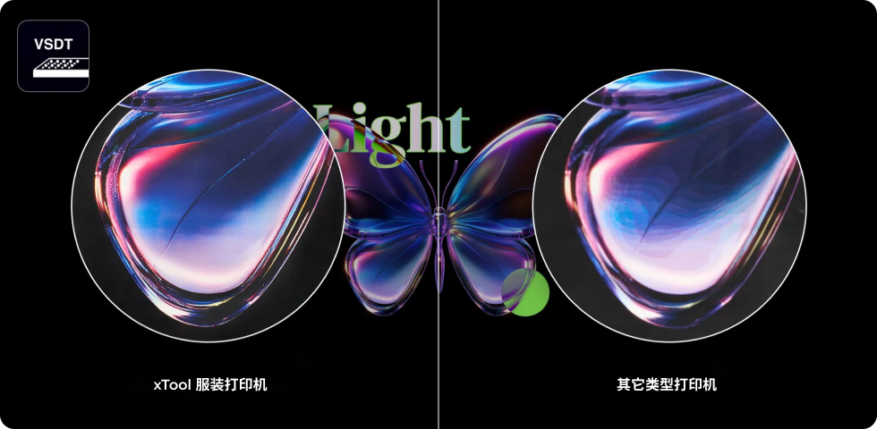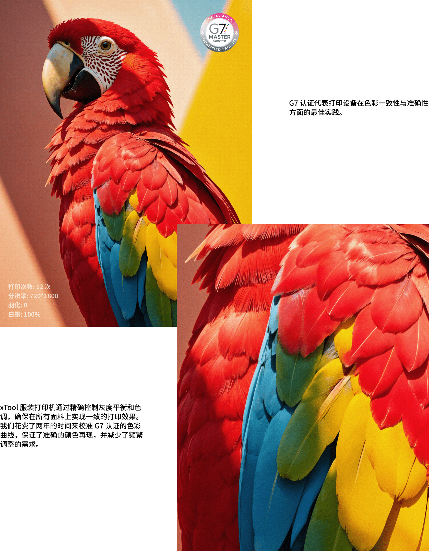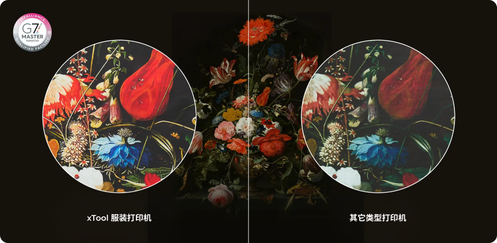 经校准至 G7 认证色彩曲线,xTool 服装打印机可将你屏幕上的颜色精准还原。