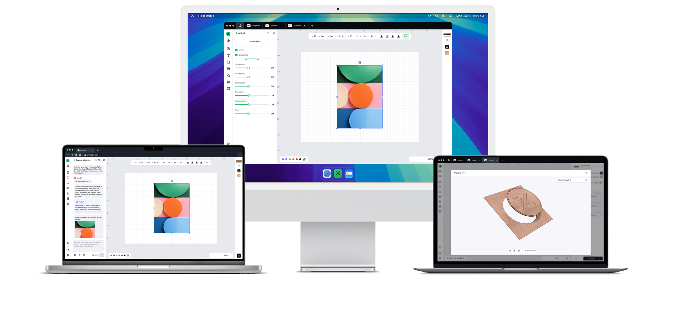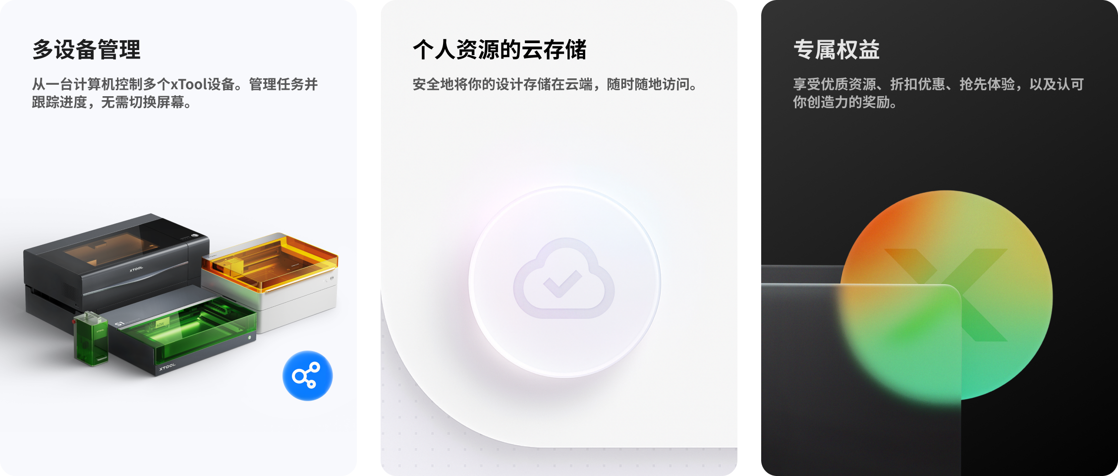 首页 软件 xTool Studio 全新的创意工作区 使用 AI 实现更智能、更轻松的 DIY 项目 立即下载 xTool Studio AI 工具 一键点击,AI工具为您设计 智能调整自动平衡亮度、对比度和颜色,呈现完美视觉效果。自动增强提升分辨率和细节,使图像瞬间更加清晰锐利。图像重绘轻松用AI驱动的创意替代品替换选定对象。AI抠图快速去除背景,准确识别主体。创意扩展智能扩展图像,同时保持风格和自然构图。 为您准备好一切 智能工作流 看得清楚,做得聪明 旋转雕刻预览在开始之前查看您的旋转雕刻的详细信息。真实结果预览将最终效果精确可视化,减少错误与浪费。简单的参数设置即时应用最佳参数,无需猜测。 智能排料智能安排设计以实现最大材料效率。智能批量填充填写批量数据以创建多个自定义部分。设计生成器从即用型生成器出发,打造你的专属风格。 云与管理 xTool Studio 桌面版 |v1.0| 对于 macOS,请下载与您设备相匹配的安装程序 Windows MacOS适用于英特尔芯片 MacOS适用于 Apple M系列芯片 使用指南 发行说明 最低配置要求 历史版本 xTool Creative Space 手机 & iPad XCS v2.2.0 iPad iOS 安装指引 安卓 操作指南